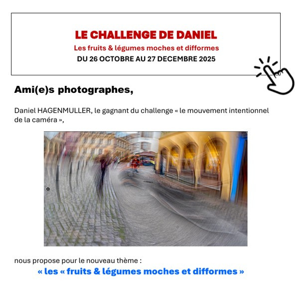 Daniel HAGENMULLER, le gagnant du challenge « le mouvement intentionnel de la caméra », nous propose pour le nouveau thème du challenge :